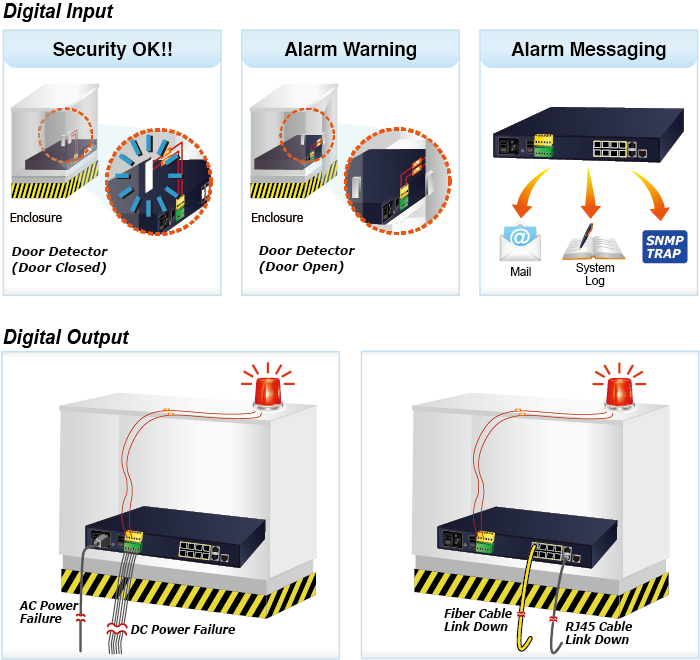 El MGSD-10080F admite entrada digital y salida digital en el panel frontal. La alarma externa ofrece a los técnicos la posibilidad de utilizar la entrada digital para detectar y registrar el estado de los dispositivos externos (como el detector de intrusión de puertas) para la alarma, ya que la salida digital se puede utilizar para avisar si el MGSD-10080F tiene un enlace de puerto inactivo, un enlace activo o una falla de energía.