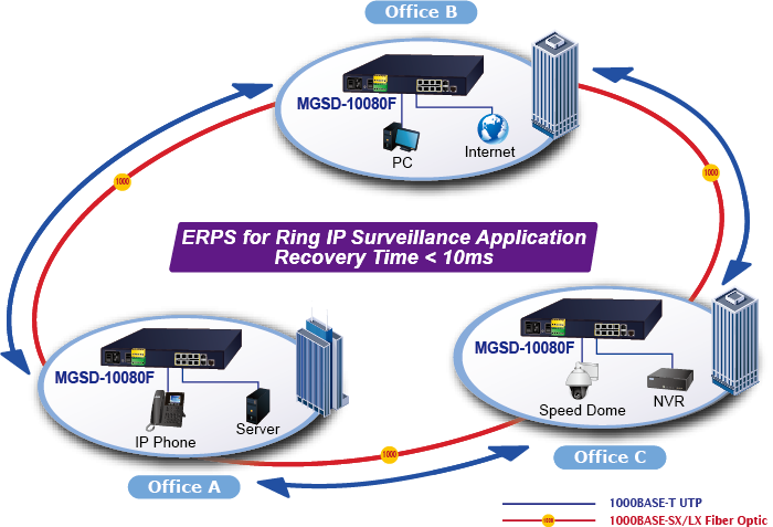 El MGSD-10080F admite la tecnología de anillo redundante y cuenta con una capacidad de autorrecuperación rápida y sólida para evitar interrupciones e intrusiones externas. Incorpora tecnología avanzada ITU-T G.8032 ERPS (Ethernet Ring Protection Switching), protocolo Spanning Tree (802.1s MSTP) en la red del cliente para mejorar la confiabilidad del sistema y el tiempo de funcionamiento en varios entornos.