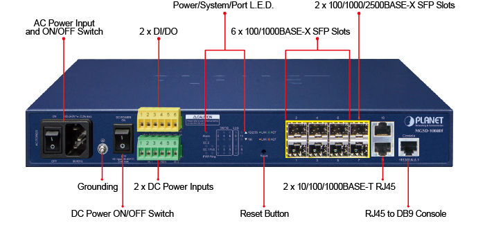 Para mejorar la confiabilidad y flexibilidad de la operación, el MGSD-10080F está equipado con una unidad de fuente de alimentación de CA de 100 ~ 240 V y dos conectores de entrada de alimentación de CC de 36 ~ 60 V adicionales para la instalación de una fuente de alimentación redundante. Los sistemas de alimentación redundante están diseñados específicamente para manejar las demandas de instalaciones de alta tecnología que requieren la máxima integridad de la energía. Además, con la fuente de alimentación de CC de 36 ~ 60 V implementada, el MGSD-10080F se puede aplicar como el dispositivo de nivel de telecomunicaciones que podría ubicarse en la sala electrónica.