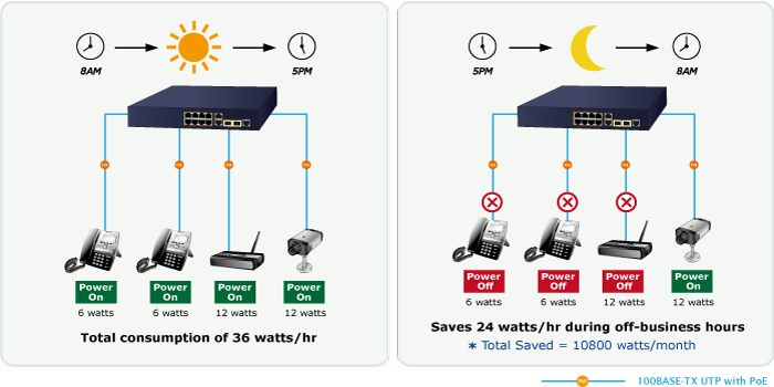 Además de utilizarse para vigilancia IP, el FGSD-1008HPS es ciertamente aplicable para construir cualquier red PoE, incluidas VoIP y LAN inalámbrica. Siguiendo la tendencia mundial de ahorro de energía y contribuyendo a la protección del medio ambiente en la Tierra, el FGSD-1008HPS puede controlar eficazmente la fuente de alimentación, además de su capacidad de proporcionar una alta potencia en vatios. La función de “programación PoE” le ayuda a habilitar o deshabilitar la alimentación de energía PoE para cada puerto PoE durante intervalos de tiempo específicos y es una función poderosa para ayudar a las PYMES y empresas a ahorrar energía y presupuesto.