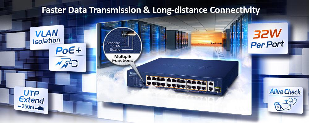 Con esta nueva función, el FGSD-2621P proporciona una solución adicional para la extensión de distancia PoE+ 802.3at, ahorrando así el coste de instalación del cable Ethernet.