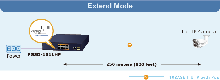 En el modo de operación “Extendido”, el FGSD-1011HP funciona por puerto a una velocidad de funcionamiento dúplex de 10 Mbps, pero puede admitir una salida de energía PoE de 30 vatios a una distancia de hasta 250 metros, superando el límite de 100 m del cable UTP Ethernet. Con esta nueva característica, el FGSD-1011HP proporciona una solución adicional para la extensión de la distancia PoE 802.3af/at, ahorrando así el costo de la instalación del cable Ethernet. Su función de aislamiento VLAN aísla cada puerto para evitar tormentas de transmisión y defenderse de la suplantación de DHCP en el modo de operación "Extender".