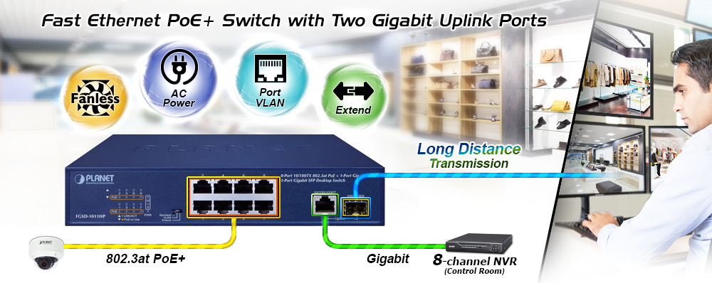 El FGSD-1011HP, un nuevo miembro de la familia de conmutadores Fast Ethernet PoE 802.3at de PLANET, ofrece 8 puertos de 10/100 Mbps con alimentación a través de Ethernet 802.3af/at, 1 puerto Gigabit y 1 puerto SFP Gigabit con un total de 120 vatios de presupuesto PoE. Su presupuesto de energía es más que suficiente para cualquier aplicación de red con transmisión a velocidad Fast Ethernet. Los ocho puertos PoE 802.3af/at cuentan con una función de inyector de energía PoE que puede controlar 8 dispositivos alimentados que cumplen con IEEE 802.3at. El FGSD-1011HP también ofrece un rendimiento a velocidad de cable simple, rentable y sin bloqueos. Viene con una carcasa de metal compacta de 9 pulgadas, adecuada para la implementación de escritorio en aplicaciones de red departamentales o de oficina SOHO.