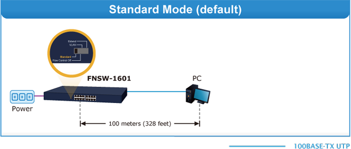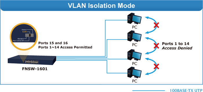 En el modo de funcionamiento "Extend", el FNSW-1601 funciona por puerto a una velocidad de funcionamiento dúplex de 10 Mbps, pero puede transmitir datos a una distancia de hasta 200 metros, superando el límite de 100 m del cable UTP Ethernet. Con esta nueva función, el FNSW-1601 proporciona una solución adicional para la extensión de la distancia, ahorrando así el coste de la instalación del cable Ethernet. Su función de aislamiento VLAN aísla cada puerto para evitar tormentas de difusión y defenderse de la suplantación de DHCP en el modo de funcionamiento "Extend".
