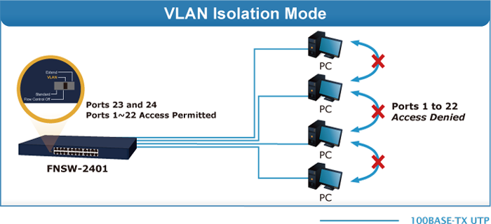 En el modo de funcionamiento "Extender", el FNSW-2401 funciona por puerto a una velocidad de funcionamiento dúplex de 10 Mbps, pero puede transmitir datos a una distancia de hasta 200 metros, superando el límite de 100 m del cable UTP Ethernet. Con esta nueva función, el FNSW-2401 proporciona una solución adicional para la extensión de la distancia, ahorrando así el coste de la instalación del cable Ethernet. Su función de aislamiento de VLAN aísla cada puerto para evitar tormentas de difusión y defenderse de la suplantación de DHCP en el modo de funcionamiento "Extender".
