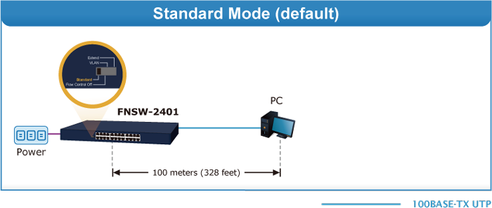 El nuevo FNSW-2401 ofrece el modo “Estándar”, “Control de flujo desactivado”, “VLAN” o “Extendido”. El FNSW-2401 funciona como un conmutador Fast Ethernet normal en el modo de operación “Estándar”.