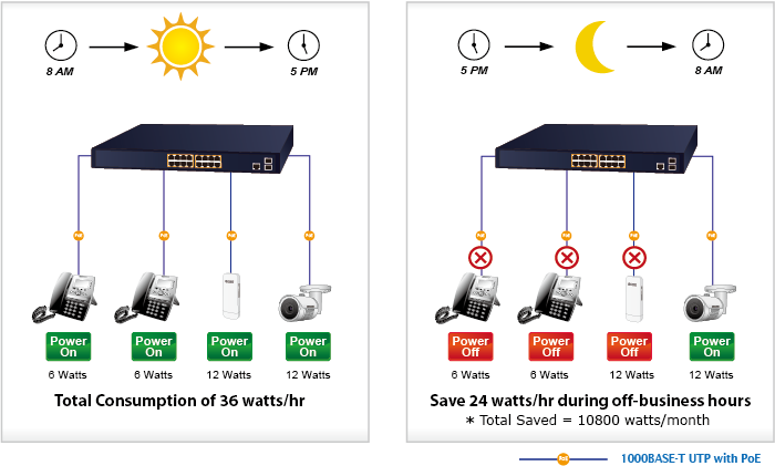 En el marco de la tendencia mundial de ahorro de energía y de la contribución a la protección del medio ambiente, el GS-4210-16P2S puede controlar eficazmente la fuente de alimentación, además de su capacidad de proporcionar una gran potencia en vatios. La función de "programación PoE" le ayuda a habilitar o deshabilitar la alimentación de energía PoE para cada puerto PoE durante intervalos de tiempo específicos y es una función poderosa para ayudar a las PYMES o empresas a ahorrar energía y dinero. También aumenta la seguridad al apagar los PD que no deberían estar en uso durante las horas no laborales.