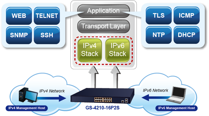 Al admitir los protocolos IPv6 e IPv4, el GS-4210-16P2S ayuda a las PYMES a dar el salto a la era IPv6 con la menor inversión, ya que no es necesario reemplazar ni revisar sus instalaciones de red si se configura la red de borde FTTx IPv6.
