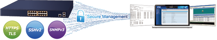 Además, el GS-4210-16P2S ofrece administración remota segura al admitir conexiones SSHv2, TLSv1.2 y SNMP v3 que cifran el contenido del paquete en cada sesión.
