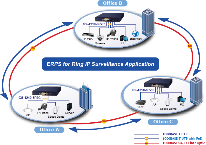 El GS-4210-8P2C admite la tecnología de anillo redundante y cuenta con una capacidad de autorrecuperación rápida y sólida para evitar interrupciones e intrusiones externas. Incorpora tecnología avanzada ITU-T G.8032 ERPS (Ethernet Ring Protection Switching), protocolo Spanning Tree (802.1s MSTP) en la red del cliente para mejorar la confiabilidad del sistema y el tiempo de actividad en varios entornos.