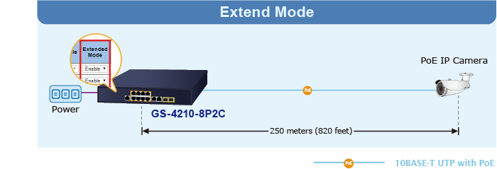 En el modo de funcionamiento "Extendido", el GS-4210-8P2C funciona por puerto a una velocidad dúplex de 10 Mbps, pero puede admitir una salida de alimentación PoE de 20 vatios a una distancia de hasta 250 metros, superando el límite de 100 m del cable UTP Ethernet. Con esta nueva característica, el GS-4210-8P2C proporciona una solución adicional para la extensión de la distancia PoE 802.3at/af, ahorrando así el coste de la instalación del cable Ethernet.