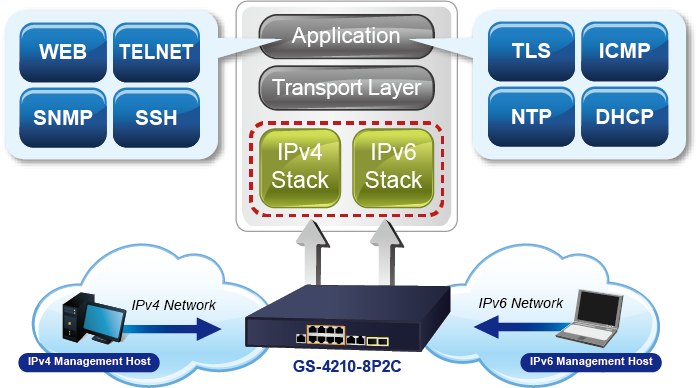 Al ser compatible con los protocolos IPv6 e IPv4, el GS-4210-8P2C ayuda a las PYMES a ingresar a la era IPv6 con la menor inversión, ya que no es necesario reemplazar ni revisar sus instalaciones de red si se configura la red de borde FTTx IPv6.