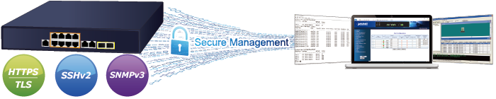 Además, el GS-4210-8P2C ofrece administración remota segura al admitir conexiones SSHv2, TLSv1.2 y SNMPv3 que cifran el contenido del paquete en cada sesión.