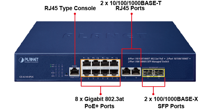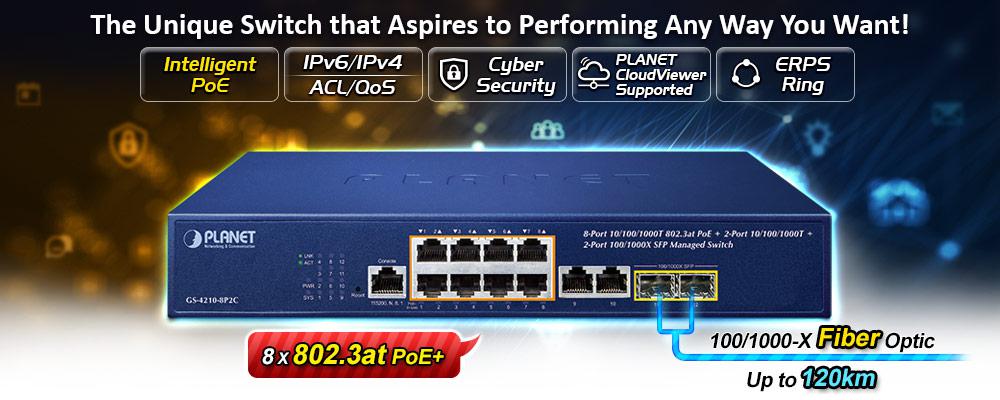 PLANET GS-4210-8P2C es un switch PoE+ Gigabit administrado de tamaño de escritorio y de costo optimizado que incluye funciones PoE inteligentes PLANET para mejorar la disponibilidad de aplicaciones empresariales críticas. Proporciona administración de doble pila IPv6/IPv4 y motor de conmutación Gigabit L2/L4 integrado junto con 8 puertos 10/100/1000BASE-T con PoE+ 802.3at de 32 vatios, 2 puertos Gigabit de cobre adicionales y 2 ranuras de fibra SFP 100/1000BASE-X adicionales. Con un presupuesto de energía total de hasta 120 vatios para diferentes tipos de aplicaciones PoE, proporciona una solución de red Power over Ethernet rápida, segura y rentable para pequeñas empresas y grandes empresas.