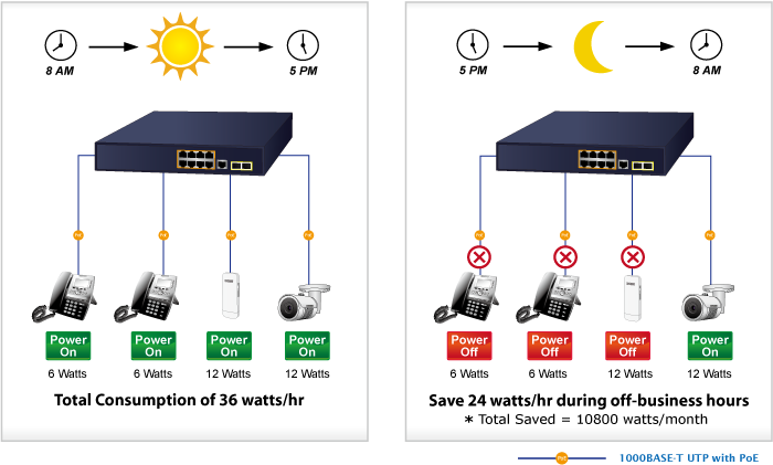 De acuerdo con la tendencia mundial de ahorro de energía y contribuyendo a la protección del medio ambiente, el GS-4210-8P2S puede controlar eficazmente la fuente de alimentación, además de su capacidad de proporcionar una gran potencia en vatios. La función de "programación de PoE" le ayuda a habilitar o deshabilitar la alimentación de energía PoE para cada puerto PoE durante intervalos de tiempo específicos y es una función poderosa para ayudar a las PYMES o empresas a ahorrar energía y dinero. También aumenta la seguridad al apagar los PD que no deberían estar en uso durante las horas no laborales.