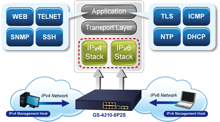El GS-4210-8P2S, compatible con los protocolos IPv6 e IPv4, ayuda a las PYMES a dar el salto a la era IPv6 con la menor inversión posible, ya que no es necesario reemplazar ni reacondicionar sus instalaciones de red si se configura la red de borde FTTx IPv6.