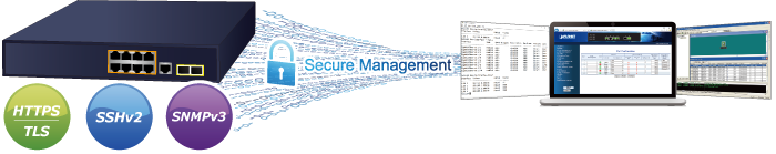 Además, el GS-4210-8P2S ofrece administración remota segura al admitir conexiones SSHv2, TLSv1.2 y SNMP v3 que cifran el contenido del paquete en cada sesión.