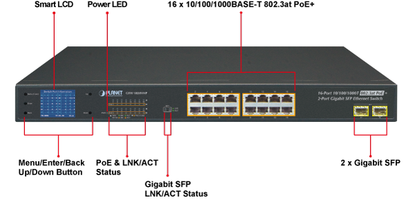 El GSW-1820VHP ofrece un panel de color intuitivo en su panel frontal que facilita la gestión de Ethernet y la gestión de PD PoE. Promueven en gran medida la eficiencia de la gestión en redes a gran escala para empresas, hoteles, centros comerciales, edificios gubernamentales y otras áreas públicas, y cuentan con las siguientes funciones especiales de gestión y estado: