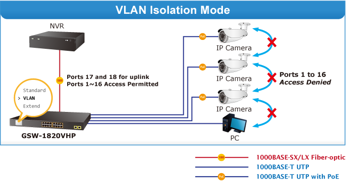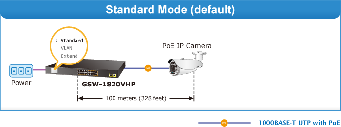 El GSW-1820VHP ofrece modos de funcionamiento Estándar, VLAN y Extendido. El GSW-1820VHP funciona como un conmutador PoE IEEE 802.3af/at normal en el modo de funcionamiento Estándar. El modo de funcionamiento VLAN presenta la función VLAN basada en puerto que puede ayudar a evitar que la tormenta de multidifusión o difusión de la cámara IP se influya entre sí.