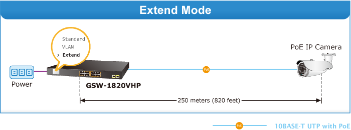 En el modo de funcionamiento Extendido, el GSW-1820VHP funciona por puerto a una velocidad de funcionamiento dúplex de 10 Mbps, pero puede soportar una potencia de salida PoE de 20 vatios a una distancia de hasta 250 metros, superando el límite de 100 m del cable UTP Ethernet. Con esta nueva característica, el GSW-1820VHP proporciona una solución adicional para la extensión de distancia PoE 802.3af/at, ahorrando así el coste de la instalación del cable Ethernet. Su función de aislamiento VLAN aísla los puertos para evitar tormentas de difusión y defenderse de la suplantación de DHCP en el modo de funcionamiento Extendido.