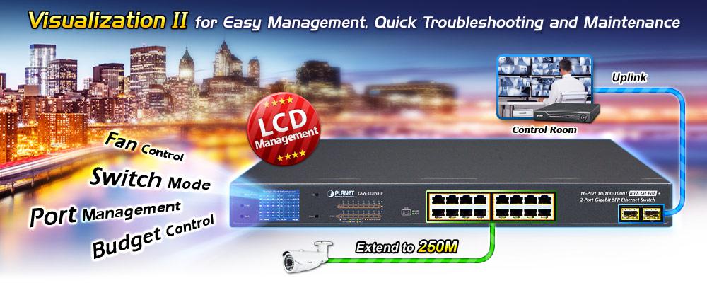 PLANET GSW-1820VHP es una solución ideal de alimentación por Ethernet con solo enchufar y ver que ofrece una instalación rápida, monitoreo del estado de trabajo de PoE en tiempo real y resolución de problemas inmediata a través de su exclusiva pantalla LCD para mejorar la eficiencia y la calidad del trabajo sin necesidad de PC ni software.