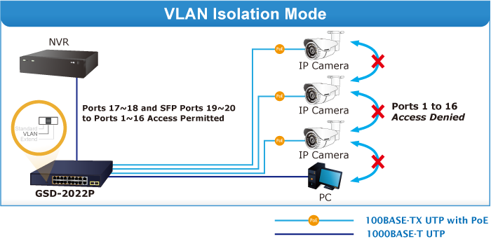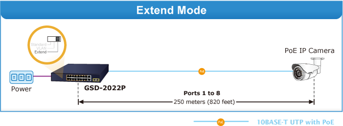 Con esta nueva función, el GSD-2022P proporciona una solución adicional para la extensión de distancia PoE+ 802.3at, ahorrando así el coste de instalación del cable Ethernet.