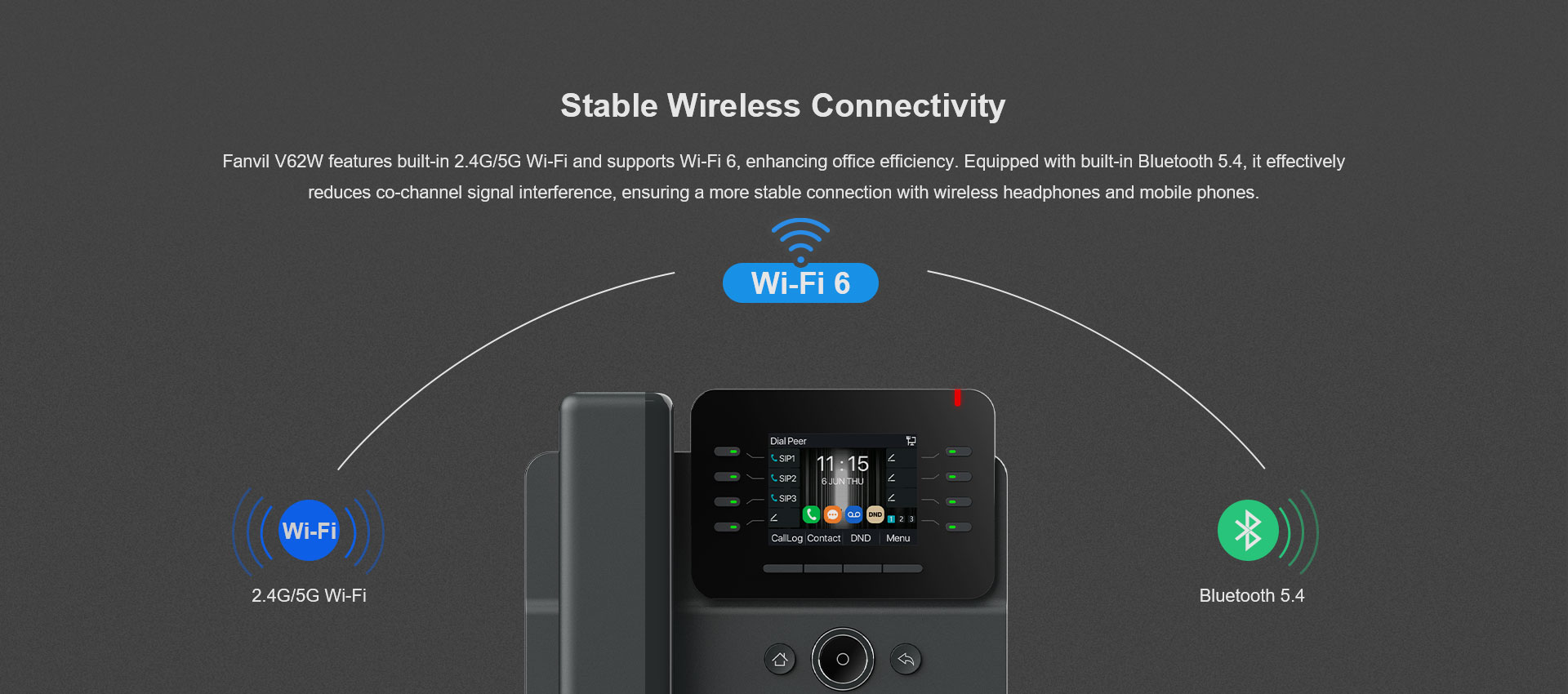 Fanvil V62W es un teléfono IP empresarial elegante y fácil de usar. Cuenta con una pantalla a color de alta definición de 2,8 pulgadas (320x240), admite 12 líneas SIP y permite una conferencia de audio de 6 vías. Con funciones enriquecidas como audio HD, puertos Gigabit duales y Wi-Fi 2.4G / 5G (Wi-Fi 6) y Bluetooth 5.4 incorporados, el V62W es adecuado para varios escenarios de aplicaciones comerciales, brindando a los usuarios una excelente experiencia interactiva y cómodos servicios de comunicación instantánea.