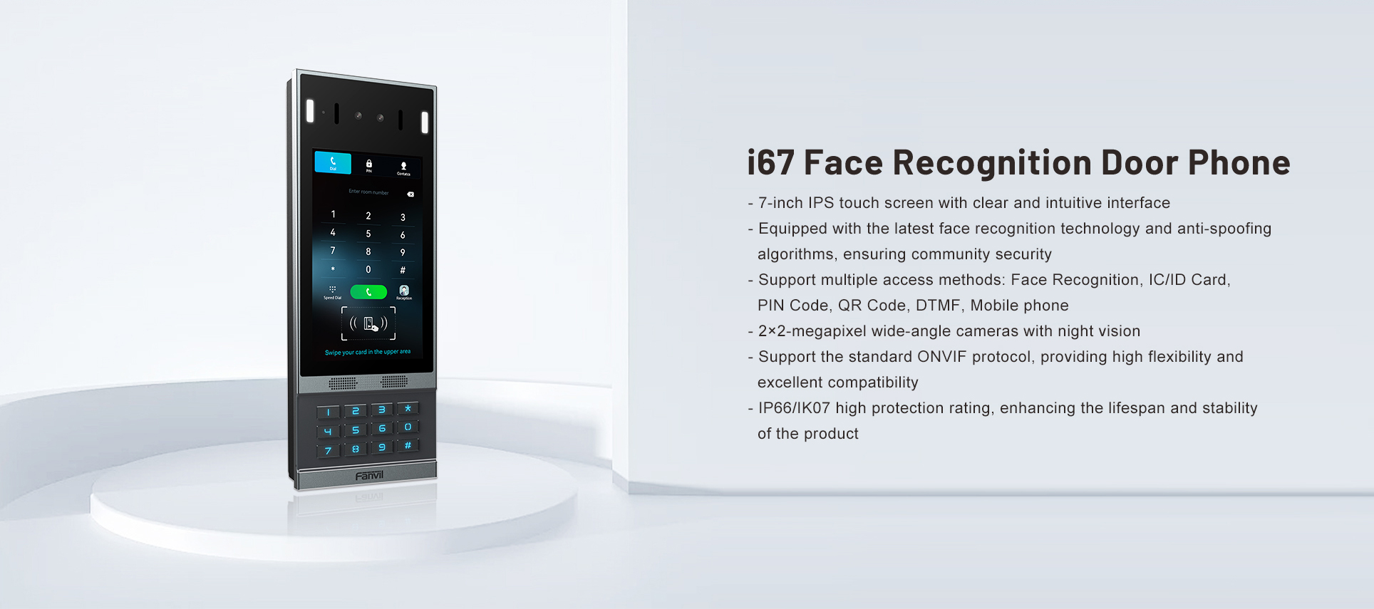 El portero automático con reconocimiento facial i67 está equipado con una pantalla táctil IPS de 7 pulgadas e incorpora tecnología de reconocimiento facial de alta precisión.